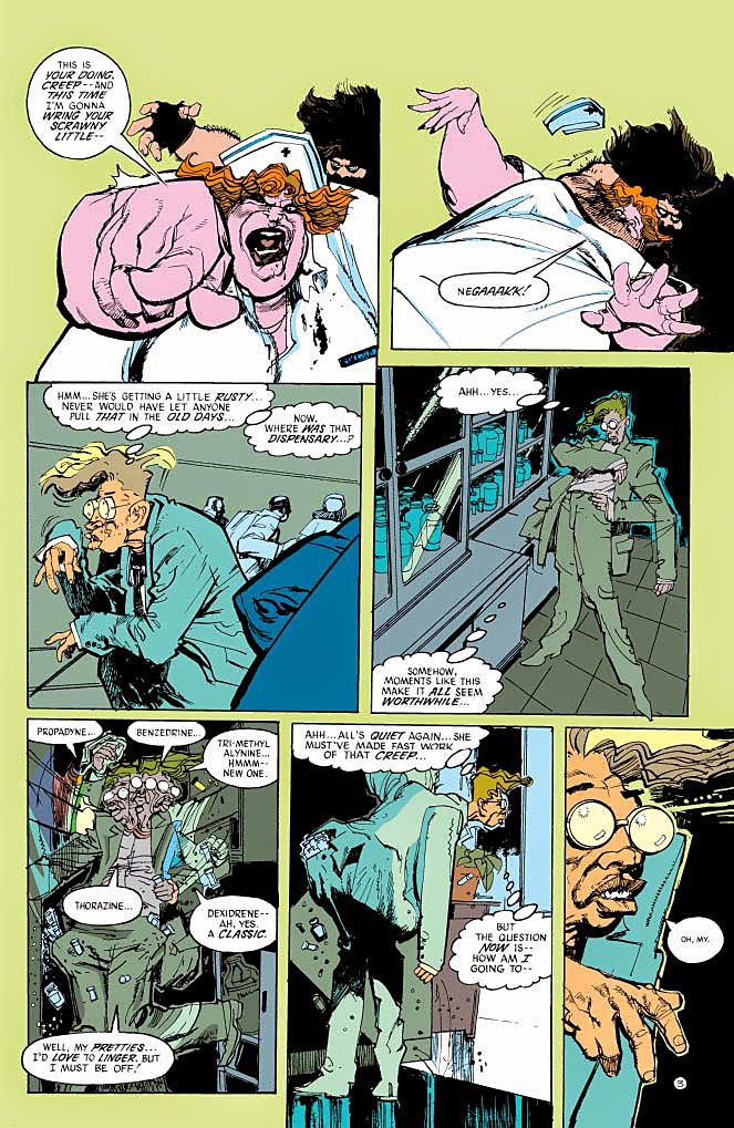 Chaykin's deal with DC was for four issues; he moved on to more enticing projects, while DC passed the script and story-boarding reins to Andy Helfer, whose concepts were engagingly rendered into the brown acid stylings of Bill Sienkiewicz.